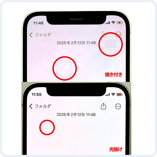 液晶に焼き付きやバックライトの漏れなどの不具合が確認できます。